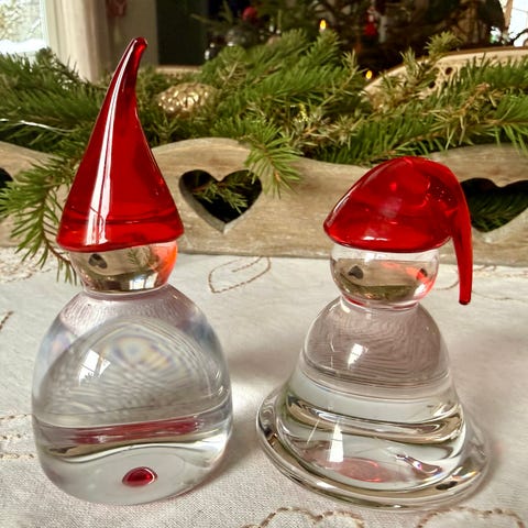 Selger 2 nydelige nisser med røde luer. Veldig fine og dekorative. Begge er i fin stand, uten skader, nag eller lignende, minimalt med slitasje. Vet ingenting om de, men de er solide, muligens håndmalte, minner om Costa Boda Noel nissen. Størrelse H: 10,5 cm, Ø på bunnen: 4,8 cm. Selges samlet for 300kr.