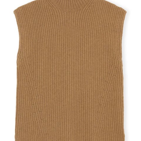 Ganni strikket vest i beige sand farge, størrelse L for dame. Vesten har ribbestrikket tekstur og høy hals. Den er ermeløs med sidesplitter, og laget for å brukes som et lagdelt plagg.