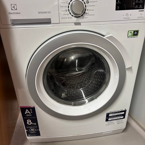 Starter og går, men har blitt halvautomatisk. Stopper i programmet og da må bryteren vris et hakk før den vasker ferdig.
