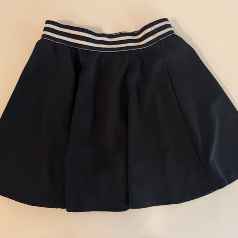 Skjørtet er pent brukt. Str. L. Midjemål ustrukket fra side til side er 44 cm, og lengde fra linning og ned er 51 cm. 75% polyester, 20% viskose og 5% elastan.