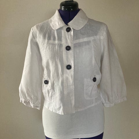 Kjolen er i tipp topp stand, men tråden til å feste knappen nederst på ene ermet er løsnet. Dette kan enkelt fikses med litt nål og tråd eller brukes som den er.