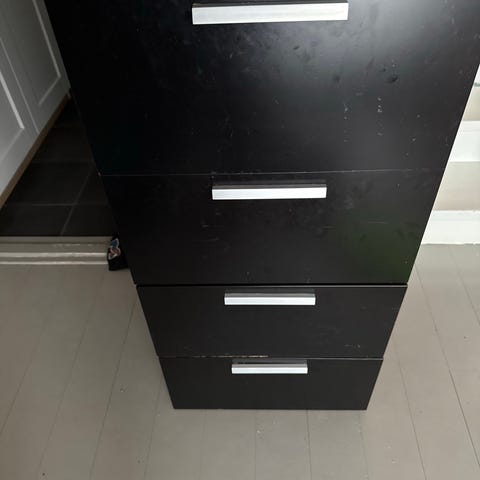 Den mangler bakplate men det har ikke vært noe savn siden vi har brukt kasser i de store rommene.