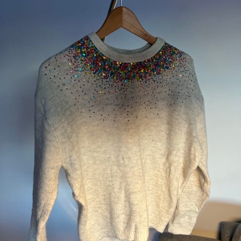 Strikk og knytting i livet, lommer og strikk nederst i bena.