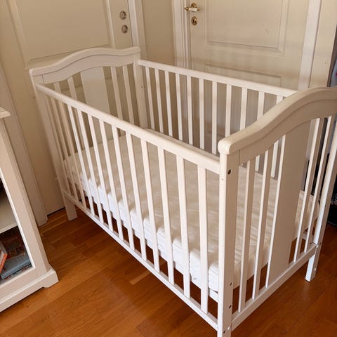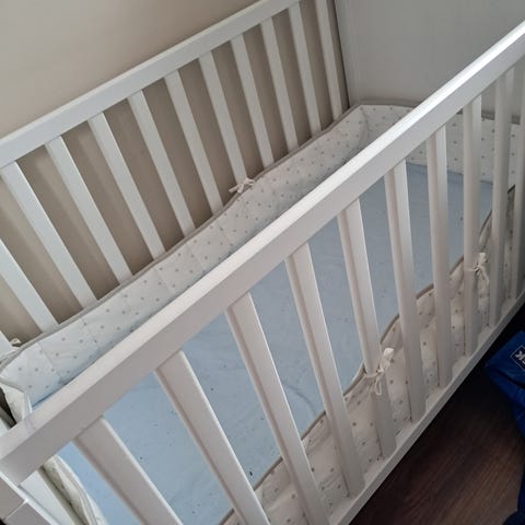 IKEA Sprinkelseng til barn i hvit farge. Laget av tremateriale med spiler på sidene for sikkerhet. Designet for små barn og gir en trygg soveplass. Kan demonteres og hentes i Hovin, Tinn eller i Kongsberg.
