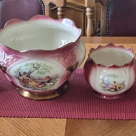 Mye patina, krakelering, samt nag her og der, men meget dekorativ og fortsatt fullt brukbar.