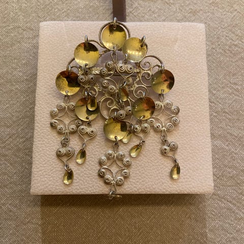 4. Stor filigranssølje med kjede. Diameter 72 mm. Har også festenål bak, kjede kan enkelt demonteres om ønskelig. kr 2500.