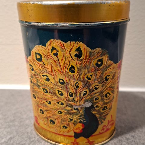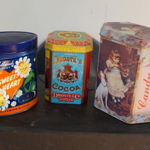 6 stykker forskjellige bokser. En dropsboks fra Freia, en til the (solgt), en til kakao (solgt), en Erbe silkedrops, en engelsk kjeksboks, to twistbokser fra Freia og en engelsk teboks. Selges høystbydende over kr 80 pr boks.
