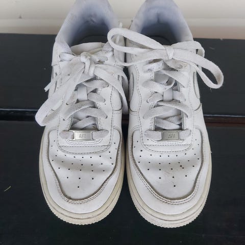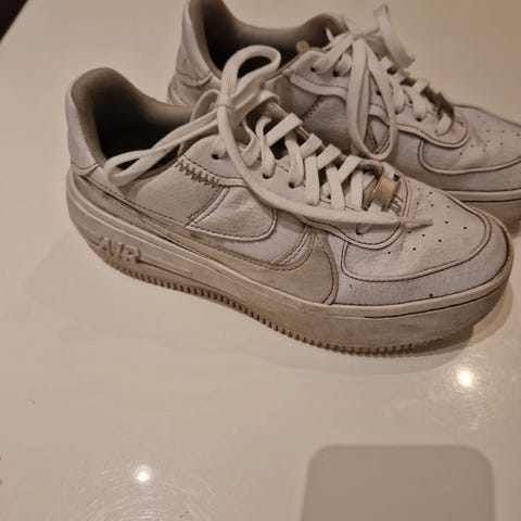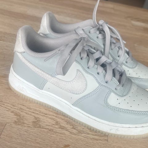 Nike Jente Sko i størrelse 39. Skoene er hvite med blå detaljer og har et brodert blomstermotiv på siden. Materialet ser ut til å være en kombinasjon av lær og tekstil. Egnet for daglig bruk.