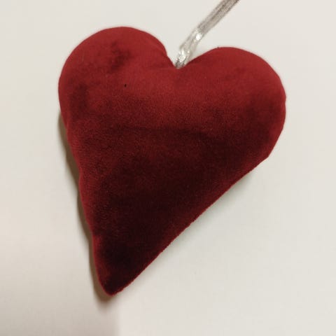 Fire hjerter til å henge opp, i flettestrikkemønster. Prisen er for alle.