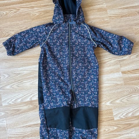 Name it Softshell Dress i størrelse 98 for jenter. Dressen er blå med blomsterprint og har forsterkninger på knær og sete. Den har hette, glidelås foran og elastiske bånd under føttene for bedre passform. Materialet er egnet for utendørs bruk og gir beskyttelse mot vind og lett regn.