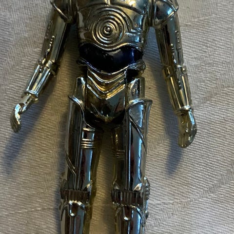 Star Wars C-3PO actionfigur laget av plast med gullfarget kropp og rød arm. Figuren har detaljer som synlige ledninger på midjen. Passer som samleobjekt eller lek for Star Wars-entusiaster.