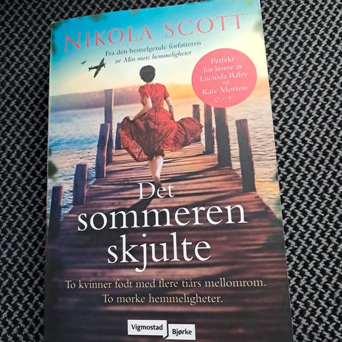 Nikola Scott Det Sommeren Skjulte er en romanbok. Boken har et omslag med et motiv av en person som sitter på en brygge ved sjøen. Inneholder to kvinnelige hovedpersoner og temaer som hemmeligheter og mørke sannheter. Boken er brukt, med synlige tegn på slitasje på sidene.