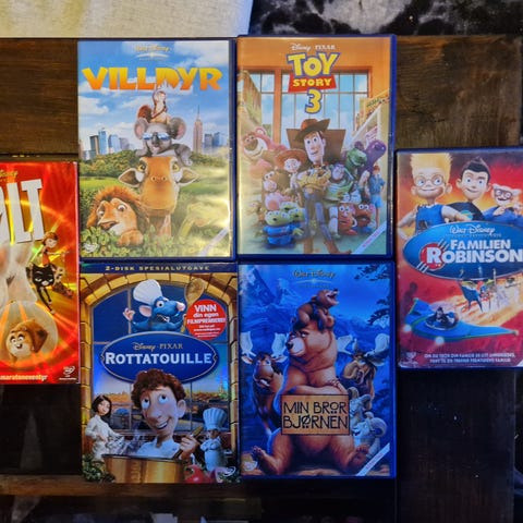 Populær barnefilm fra Disney, Pixar og Dreamworks selges for 20 - 40 kr stykk. Noe ungdomsfilm.