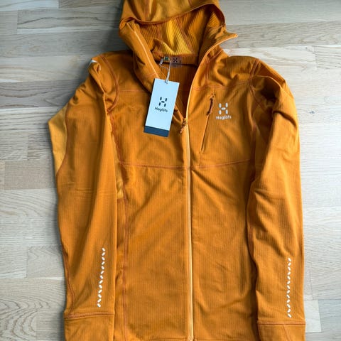 Haglöfs fleecegenser for damer i størrelse S. Genseren er rød og laget av fleece-materiale, egnet for utendørsaktiviteter og friluftsliv. Polartec-merket ❤️