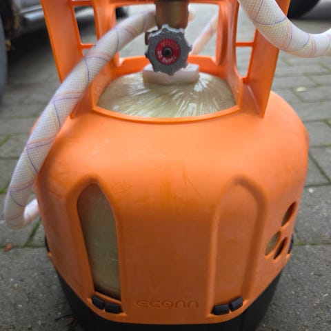 Propan gassflaske med ledning. Flasken er nesten full. Den må hentes.