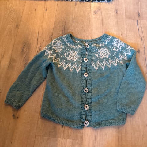 Dette er en hjemmestrikket ullgenser. Den er som ny og er i veldig fin tilstand. Den passer for barn i alderen 7-8 år