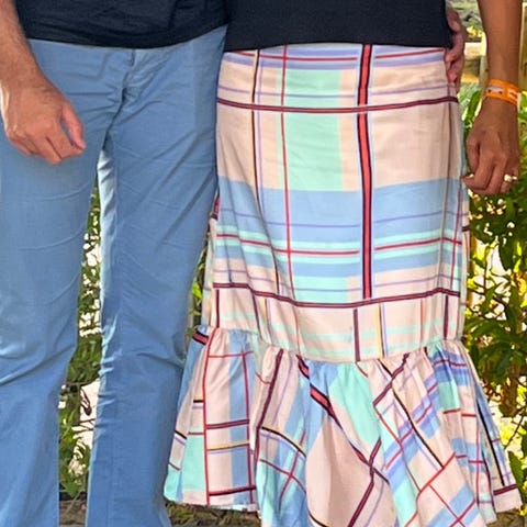Skjørtet er elastisk i linningen, har lommer på siden, og et lyst underskjørt.