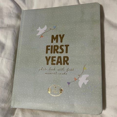 My First Year fotoalbum med øyeblikkskort fra Søstrene Grene. Albumet brukes til å dokumentere barnets første år med plass til bilder og notater.