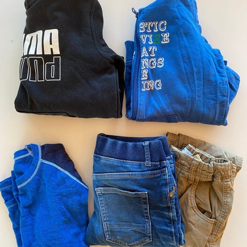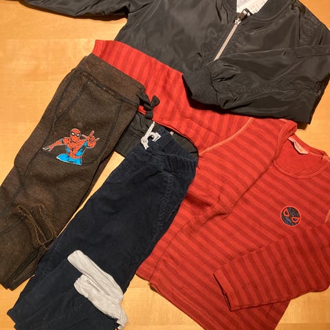 Name it langermet tynn genser i 95 prosent bomull, med Adventures motiv, H&M rødrutete langermet skjorte, 100 prosent bomull, tøff LAB industries olabukse ( med fôr inni), bomull i størrelse 116. KappAhl.