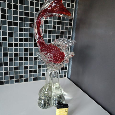 Skulpturen har en gjennomsiktig kropp med luftbobler i glasset, og detaljer som finner og hale i klart glass.