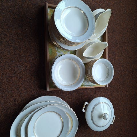 Servise selges. Stavanger Flint. Kopper, tefat, store asjetter 12 av hver, små asjetter 8 stk. Fat, skål, krukke med lokk. Se bilde.