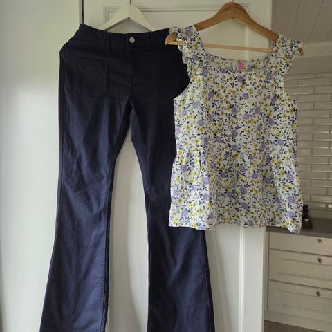 To stk penbukser i str 164 selges samlet. Svært pent brukt. Den en buksen er fra Ryvls og er en flare/bootcut med press foran. Den andre er fra Kappahl og har rette, vide ben og legg foran.