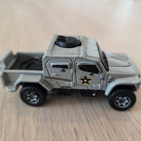 Defender militær tank og transportbil i plastmateriale. Settet inkluderer en tanfarget tank med roterende tårn og en transportbil med tilhenger. Passer for samlere som er interessert i militære kjøretøy i miniatyr. Lengde: ca. 35 cm. Selges som det ses på bildene. Kan sendes med PostNord, frakt tilkommer med 69,-.