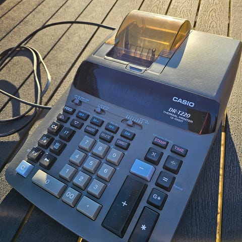 Citizen CX-778II elektronisk kalkulator med 12-sifret display. Enheten er svart og drives av 4 AA-batterier eller en adapter (DC6V, 1.6W). Beregnet for generell bruk med funksjoner som tid, skatteberegning og grunnleggende matematikk.