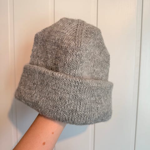 Grå lue fra Woodling- str one size, 32% alpaca, 32 % merino ull, polyamid og elastin. Deilig og varm