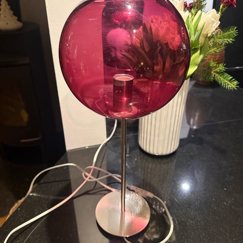 Bordlampe med glasskuppel og metallbase i svart. Lampen har en synlig lyspære og et minimalistisk design. Passer til bruk som dekorativ belysning i ulike rom.