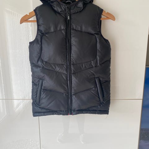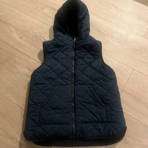 H&M vattert vest for barn i størrelse 122/128 i fargen svart. Vesten har hette og lukkes med glidelås. Egnet for gutter, laget i lett og isolerende materiale.