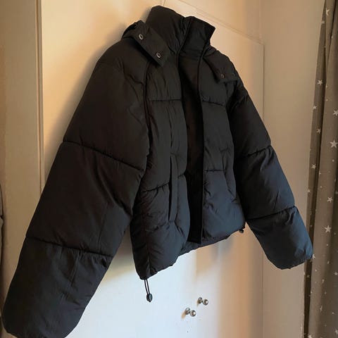 KappAhl vinterjakke for barn i størrelse 170, farge svart. Jakken har en polstret design med glidelås foran og lommer. Refleks bak. Kun prøvd på.