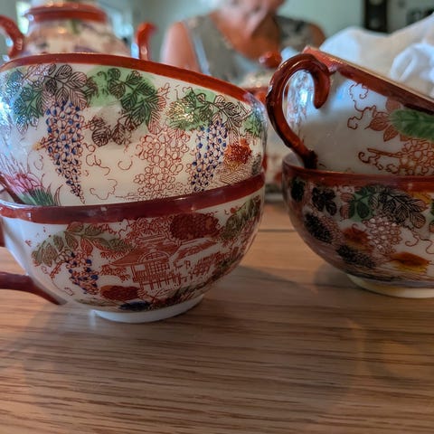 Kinesisk keramikk tekanne med lokk og håndtak i brun farge, dekorert med blå og hvite mønstre og figurer. Settet inkluderer to små blå og hvite kopper, to små skåler og en skål med blått blomsterdekor. Materialet er keramikk, og designet har tradisjonelle kinesiske motiver.