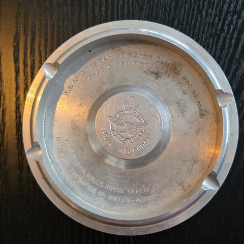 Askebeger formet som et bildekk med metallinnsats. Str Ø 17, H 4 cm.