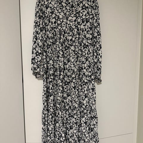Zizzi festkjole i størrelse M, farge beige med mønster. Kjolen har lange ermer og belte i livet. Materialet er lett og egnet til formelle anledninger.
