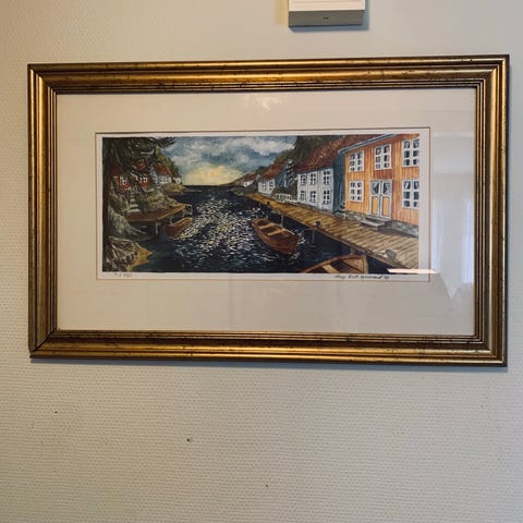Signert, innrammet kunstverk.
