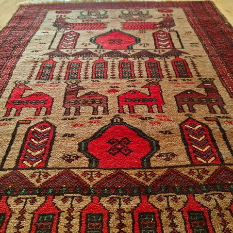 Vakkert, ekte håndknyttet Turkman-teppe i ull. Teppets klassiske røde nyanser og tradisjonelle “gul”-motiv gir et varmt og autentisk uttrykk. Teppet er tett knyttet, har kort og myk luv, og ligger stabilt på gulvet.