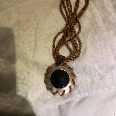 Halskjede for dame med perler i ulike farger og størrelser, samt dekorative metall- og tre-elementer. Langt smykke som kan brukes til ulike anledninger.