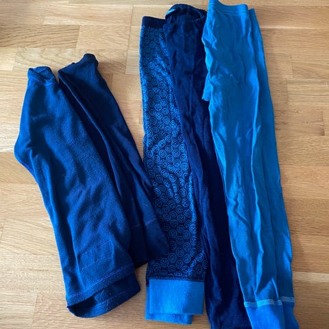 Selger en liten pakke med ullklær i str 110/116. Inneholder en genser, en tynn bukse, en tykk bukse og 3 strømpebukser.
