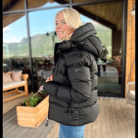 Cedrico long i svart farge, størrelse S for kvinner. Jakken har en lang modell med hette og glidelåslommer. God og varm. Veldig fin passform.