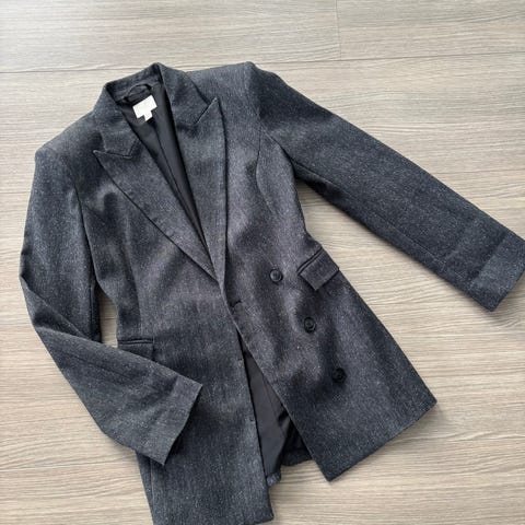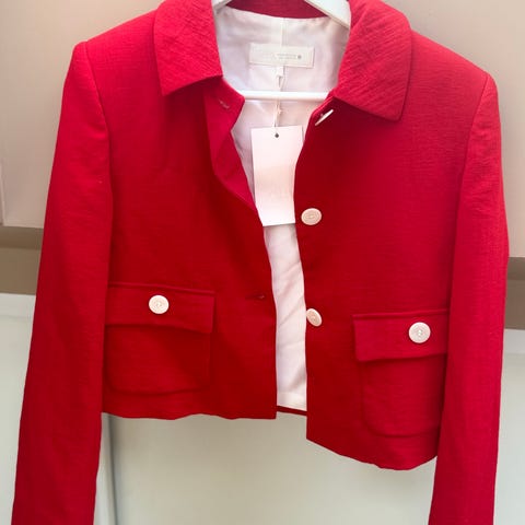 Jakke i svart farge med peplumdetalj. Størrelse XS for kvinner. Materiale består av 75% polyamid og 25% elastan, med fôr av 100% polyester. Jakken har glidelås foran og strukturert stoff på sidene.