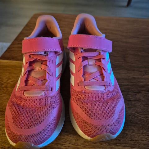 Adidas barnesko i størrelse 33, til jente. Skoene har blå og rosa farger med borrelåslukking og er laget av tekstil og syntetiske materialer. Passer til daglig bruk for barn.