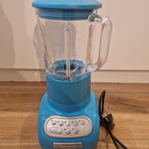KitchenAid Classic blender med en kapasitet på 1,5 liter. Blenderen har en hvit plastkropp og en klar plastkanne med svart håndtak. Utstyrt med flere hastighetsinnstillinger og pulsfunksjon, egnet for miksing av ulike ingredienser. Strømforsyning via ledning.