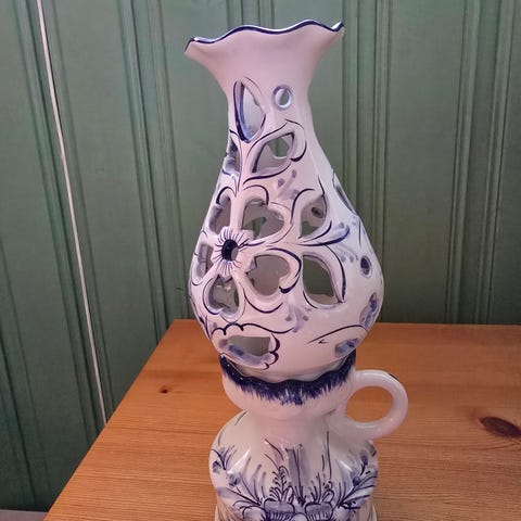 lysestake laget av keramisk materiale. Lysestaken har en hvit base med blå blomsterdekor og er utformet for å holde et enkelt lys. Passer for dekorative formål og bruk i hjemmet.