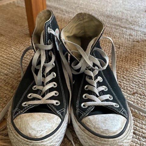 Høye Converse med tynn såle. Kule! De var desverre for små for meg, passer en 38,5-39. Lite brukt, noen bruksmerker. Kan fint vaskes, men kommer som de er fra meg. :)