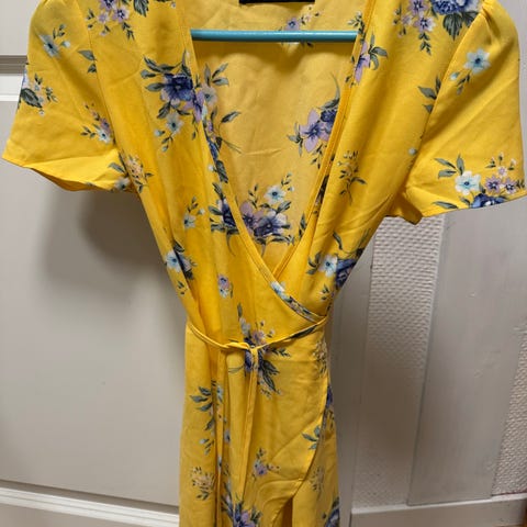Kort sommerkjole i størrelse 44 fra H&M. Kjolen er gul med blomsterprint og korte ermer. Kjolen har trykknapper foran og knytebelte i livet for justering av passform. Pent brukt.