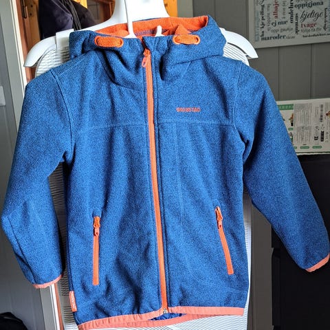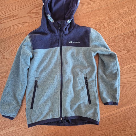 Bergans Hareid fleecejakke i størrelse 128, grønn farge, unisex modell. Jakken har hette og glidelås, laget for barn i denne størrelsen. Materialet gir varme og komfort.