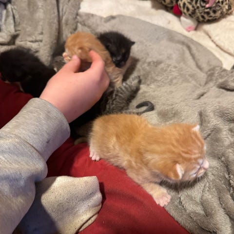 To av kattungene er oransje (hannkatter), og de to andre er tricolor. (Grå/svart, oransje og hvit)(hunnkatter)
