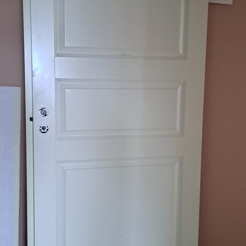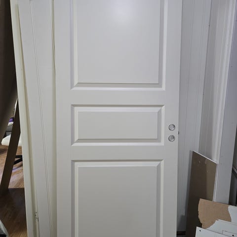Dør med karm selges.72.5 cm bred.2.04 høy.Døren er i eik.Baksiden er behandlet med 1 strøk grunning.