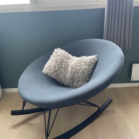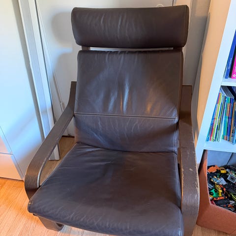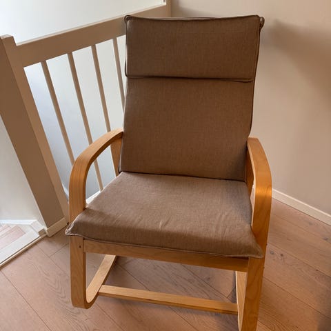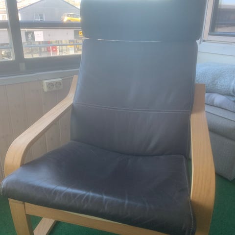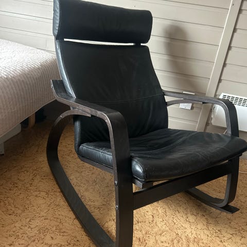 Pent brukt poänggyngrstol fra ikea . Brunsvart stamme og brunt skinn på puten.